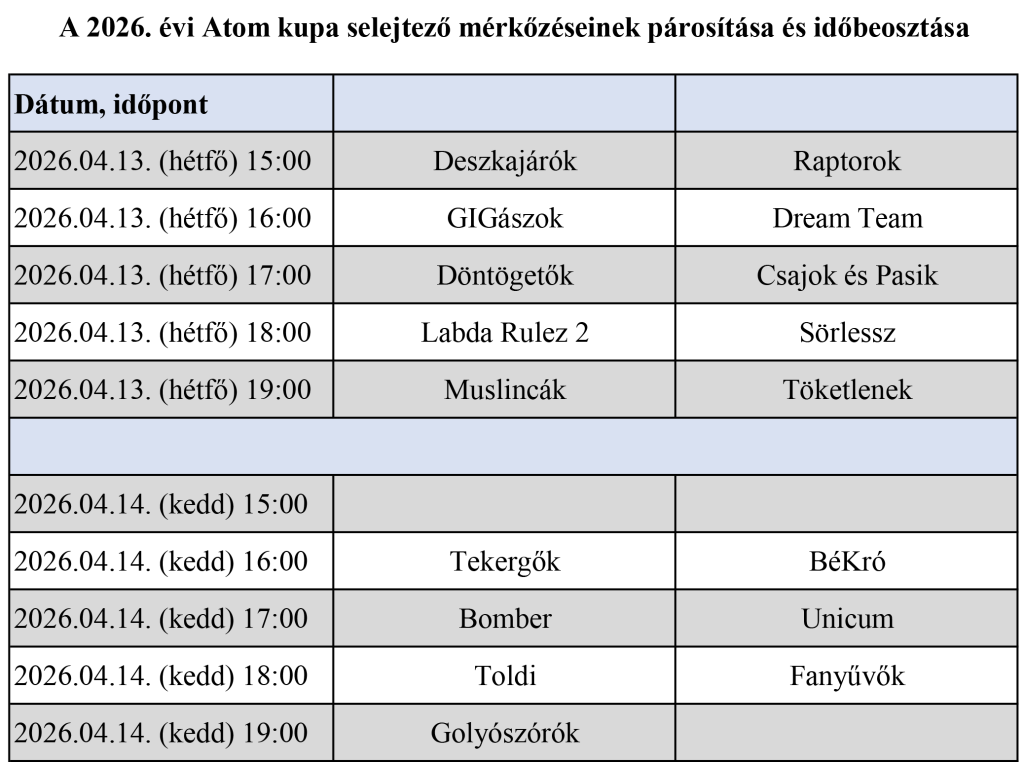 Alább találjátok az atom kupa párosítást és az időbeosztást.