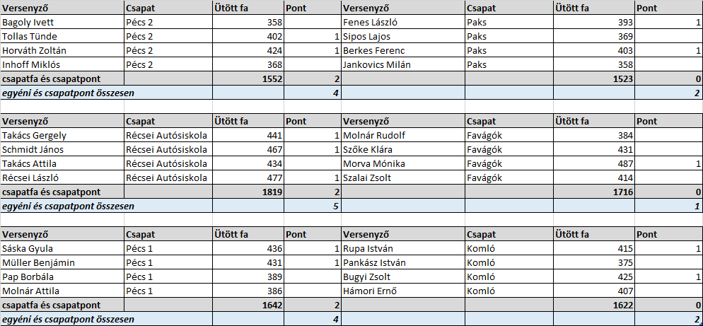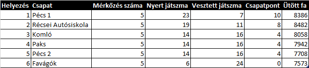 A hétvégén megrendezésre került a Dél-Dunántúli Területi Teke verseny 5. fordulója. A pécsi csapatok sikerrel vették a hazai mérkőzésüket a Komló és a Paks ellen, míg a kaposvári házi rangadón ezúttal a Récsei Autósiskola bizonyult jobbnak és magabiztos 5-1-es győzelmet aratott a Favágók ellen.