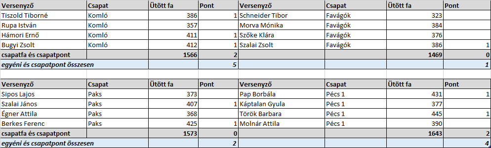 Az eredményeken és a tabellán kívül feltétlen említésre méltó, hogy az előző idény alapján a leggyengébb eredményeket hozó paksi pályán bravúros teljesítményt nyújtottak a pécsi női versenyzők. A területi bajnokság tavalyi indulásakor rögtön az első mérkőzésen (2024.09.14-én) Martonné Szász Gabriella döntötte meg a pályán elért legjobb 50 vegyes eredményt (403), melyet a hétvégén (2026.04.25-én) Pap Borbála javított meg jelentősen, 431 fával. Azonban a dicsőségtáblán nem sokáig marad fenn ezen eredmény, hiszen Török Barbarának mindössze 1 órával később ezt is sikerült túlszárnyalnia 445 fás eredményével. Mindkét versenyzőnek ezúton is gratulálunk a kiváló eredményhez!