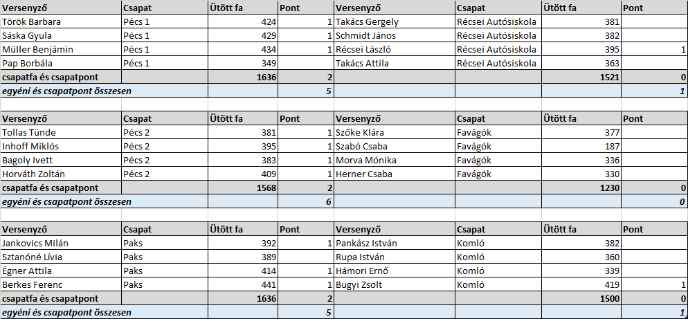 Az első fordulóban magabiztos győzelmet aratott a Paks a Komló ellen, míg Pécsen mindkettő pécsi csapat győzni tudott. A Pécs 1 meglepően könnyen múlta felül a tavalyi bajnok Récsei Autósiskola csapatát, a Pécs 2 pedig a Favágók csapatát. Utóbbi mérkőzésen sajnálatos esemény volt, hogy Szabó Csaba „félidőben” sajnos feladni kényszerült a mérkőzést. 🙁 Kívánjuk, hogy megerősödve térjen vissza a pályára!