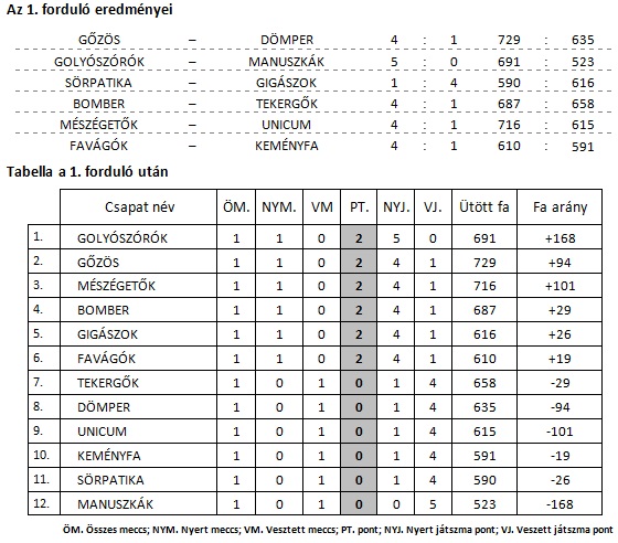 Az első forduló kicsit idény eleji formában indult. Nem születtek kiemelkedő eredmények a felújított tekepályán. Az első mérkőzésen, a tavalyi bajnokok (I. és II. osztály) csaptak össze. Hála Pintér Zsolt top10-es eredményének, a DÖMPER tisztes helytállással debütált. A SÖRPATIKA csapata meglepetésre kikapott a tavalyi újonc GIGÁSZOK-tól és ezzel a tabella végére kényszerültek. A GOLYÓSZÓRÓK csapata végzett az élen, hála az egyedüli 5 – 0 eredménynek és természetesen a MANUSZKÁK csapatának. 700 fa feletti eredményt csak a GŐZÖS és a MÉSZÉGETŐK értek el, ők foglalják el a tabella második és harmadik helyét. Gratulálunk a csapatoknak és üdvözlünk mindenkit a Városi Bajnokság 2018-19. őszi szezonjában!