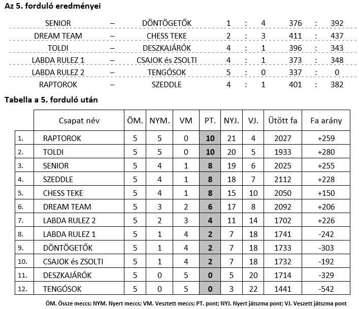 Az 5. forduló meglepetések és érdekes eredményekkel záruló mérkőzések sorát hozta a II. osztályban. Mindjárt az első párharcban, a SENIOR vérzett el a Döntögetőkkel szemben, akiktől komoly eredménynek számít a 400 fát megözelíttő 392 csapatfa. Utánuk, a CHESS TEKE verte szoros mérkőzésen a DREAM TEAM csapatát épp csak 3 – 2 arányban. Ez után a TOLDI tartotta meg veretlenségét a II. oszályban, majd a LABDA RULEZ 1 szerezte meg első idei győzelmét. Később, a RULEZ 2 is behúzta a fordulót, mivel a TENGÓSOK csapata nem képviseltette magát. A nap zárásaként pedig a SZEDDLE csapat vesztette el veretlenségét a RAPTOROK-kal szemben, aki így át is vették a vezetést. Gratulálunk a csapatoknak, további sok fát mindenkinek!!!