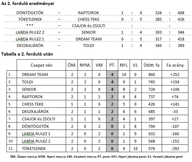 A második forduló papírforma eredményeket hozott. A CHESS TEKE játszmapont vesztés nélkül kezdte meg szereplését, a DREAM TEAM pedig továbbra is veretlenül vezeti a tabellát. A RAPTOROK is megszerezték első győzelmüket és a tartalékosan felálló SENIOR is győzött. A DESZKAJÁRÓKnál ismét a csapatkapitányra várt a mentés, mint az előző fordulóban, de most a TOLDI csapatkapitánya jobbnak bizonyult. Gratulálunk a csapatoknak!