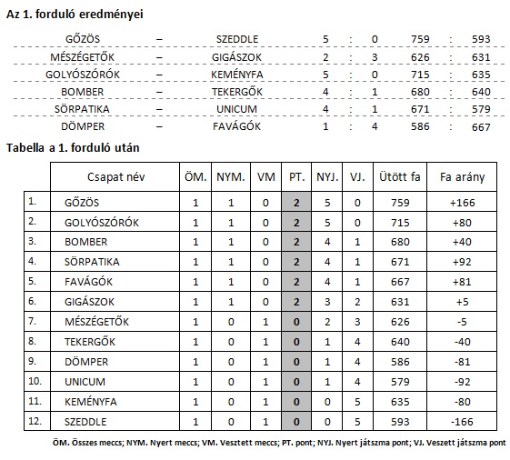 Az ilyenkor már megszokott közhelyek helyett, ideny eleje, stb.most arról tudunk beszámolni, hogy a Gőzös-nek köszönhetően komoly eredmény született, mindjárt az első forduló első mérkőzésén. A 759 fás csapat eredmény Hercegfalvi József 274 és Égner Attila 259 fás erdményének köszönhetően szépen megalapozta a fordulót. Gratulálunk a csapatoknak az eredményekhez és jó versenyzést, valamint sok fát kívánunk mindenkinek!