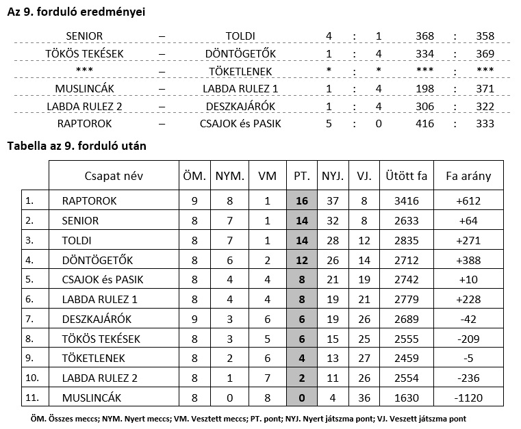 Nincs már veretlen csapat a II. osztály bajnokságában. A TOLDI vereségével ismét hármas holtverseny alakult ki az élen és csak a mérkőzések száma és a győztes játszmák aránya rangsorol. A papírformát tekintve az utolsó fordulóra marad a döntés, melyik két csapat végez feljutó első két helyen. Izgalmas végjáték következik. Gratulálunk a csapatoknak, további sikereket kívánunk!