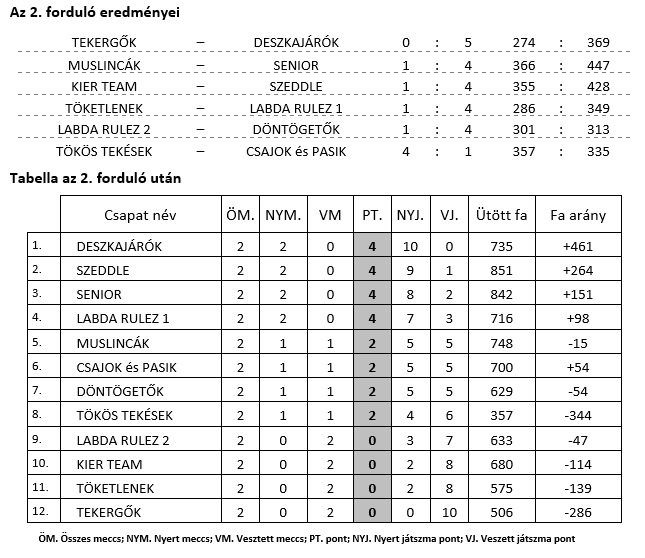 Villám rajtot vettek a DESZKAJÁRÓK. Nem kicsi meglepetésre a tabella élén, vesztett játszma pont nélkül áll a csapat. A folytatásban érvényesül(t) a papírforma. A SZEDDLE és A SENIOR nagyarányú győzelemmel követi szorosan az éllovast. A forduló „akire büszkék vagyunk” rovatába most női és férfi játékosra bontva is kiemelkedő eredményeket jegyezhetünk. Hanol Andrea kiemelkedő 147 fája és Buglyó András, ha lehet még szebb 177 fája a leginkább megsüvegelendő teljesítmény! Gratulálunk a játékosoknak és a csapatoknak, további sok fát mindenkinek!