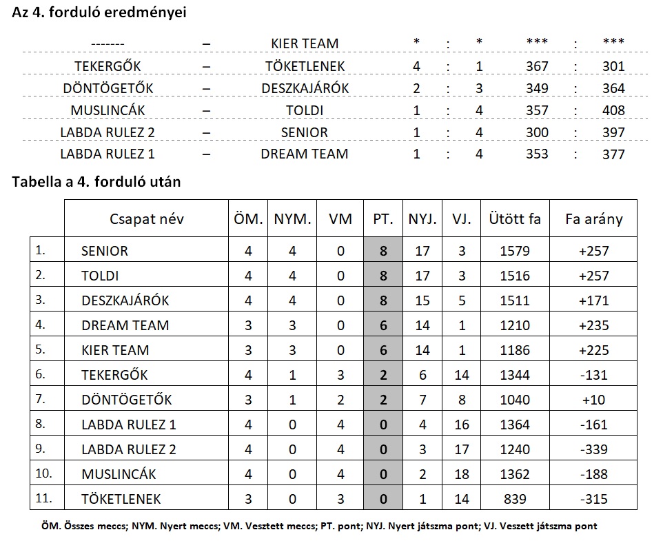 Folytatódtak a papírforma szerű eredmények a II. osztály mérkőzésein, ahol ismét utólérte magát a bajnokság, immár a 4. fordulóval. Örömmel olvashatjuk, hogy egyre jobb egyéni eredmények kerülnek a top10-es táblázatba és néha előfordul 400 fa feletti csapat eredmény. A forduló legnagyobb izgalmmakat hozó mérkőzése, a szoros csatában eldőlt DÖNTÖGETŐK – DESZKAJÁRÓK meccs volt, amit 2:3 arányban utóbbi csapat tudott sikerrel abszolválni. Gratulálunk mindenkinek és további sok-sok fát kiívánunk!