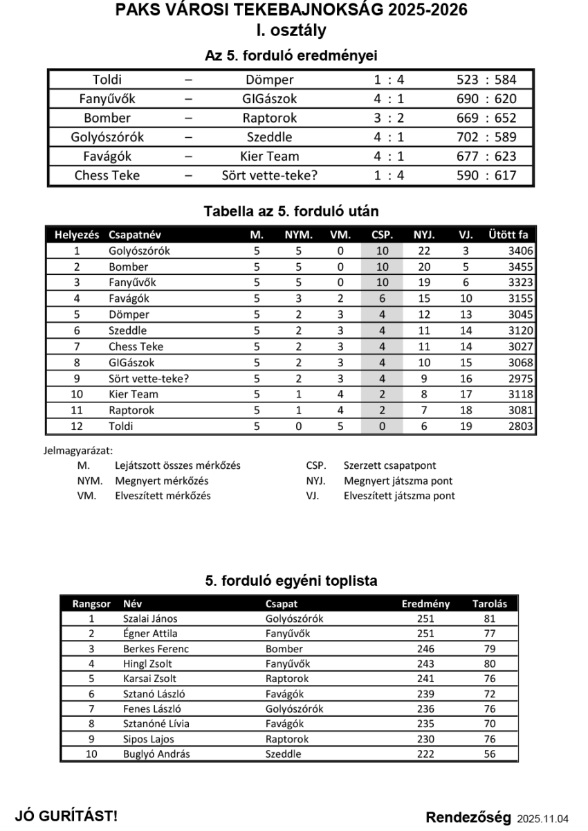 Az őszi szezon ötödik fordulója nem hozott meglepetést az élmezőnyben: a Golyószórók, a Bomber és a Fanyűvők egyaránt megőrizték hibátlan mérlegüket, miközben a középmezőnyben egyre élesebb a verseny. Nem gyakran történik olyan, hogy valamely játékos 15 teli gurításból eléri a 100 fás eredményt, ezúttal azonban ez kettő játékosnak (Egervári Csaba – GIGászok és Kródi Zoltán – Szeddle) is sikerült.