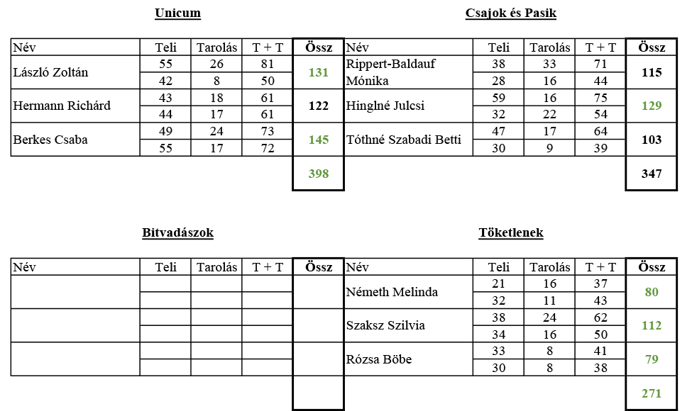 Az Unicum – Csajok és Pasik (4:1, 398–347) meccsen a vendégek a mérkőzés felénél még tartották a lépést (mindössze 2 fa különbség volt ekkor a csapatok között), de Berkes Csaba (145 fa) remek játéka révén az Unicum végül biztos győzelmet aratott.