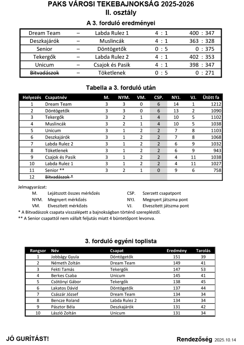A 3. forduló után a Dream Team és a Döntögetők vezeti a tabellát (6–6 csapatponttal). A Dream Team áll az élen jobb játszmaaránnyal (14–1), a Döntögetők 13–2 játszmaaránnyal a második helyen követi őket. Mögöttük a Tekergők és a Muslincák is stabil formát mutat (4–4 pont).