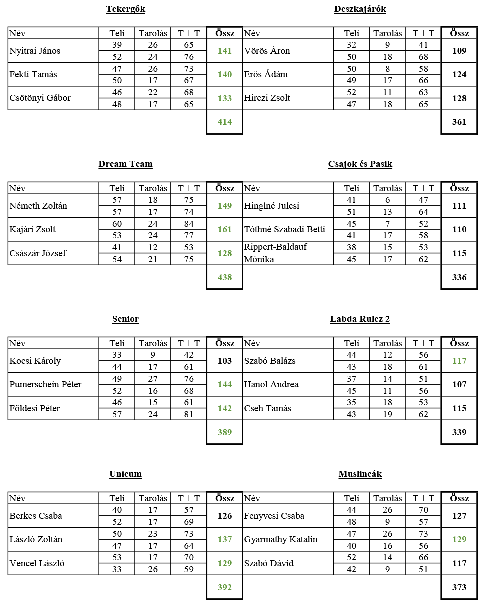 A tabella élén továbbra is a Dream Team és a Döntögetők áll hibátlan mérleggel (8–8 csapatpont), mögöttük a Tekergők 6 ponttal szorosan követi őket. Az üldözőbolyban az Unicum, a Muslincák és a Labda Rulez 1 fej fej mellett haladnak (4–4 pont), a középmezőnyt pedig a Senior és a Deszkajárók zárják.