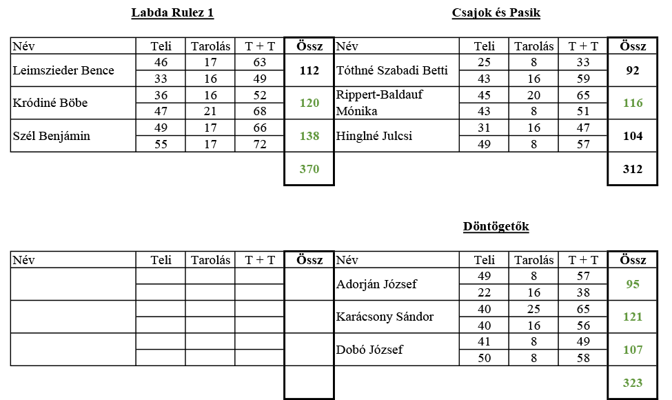 Meglehetősen nagy arányú győzelmek születtek a bajnokság 7. fordulójában, annak ellenére, hogy több mérkőzés is szoros eredményekkel indult. A DREAM TEAM őrzi vezető pozícióját, a SENIOR pedig továbbra sem kapott ki erőből (leszámítva, hogy egyszer nem tudtak kiálni). A DÖNTÖGETŐK meglepően előkelő helyen várják a folytatást, a LABDA RULEZ 1 pedig szorosan követi őket. Egyéni eredmények tekintetében, bár „csak” a forduló harmadik legjobbja lett külön megemlítendő Hermann Richárd 142 fás egyéni csúcsa (legalább is a mi könyvelésünk szerint)!
